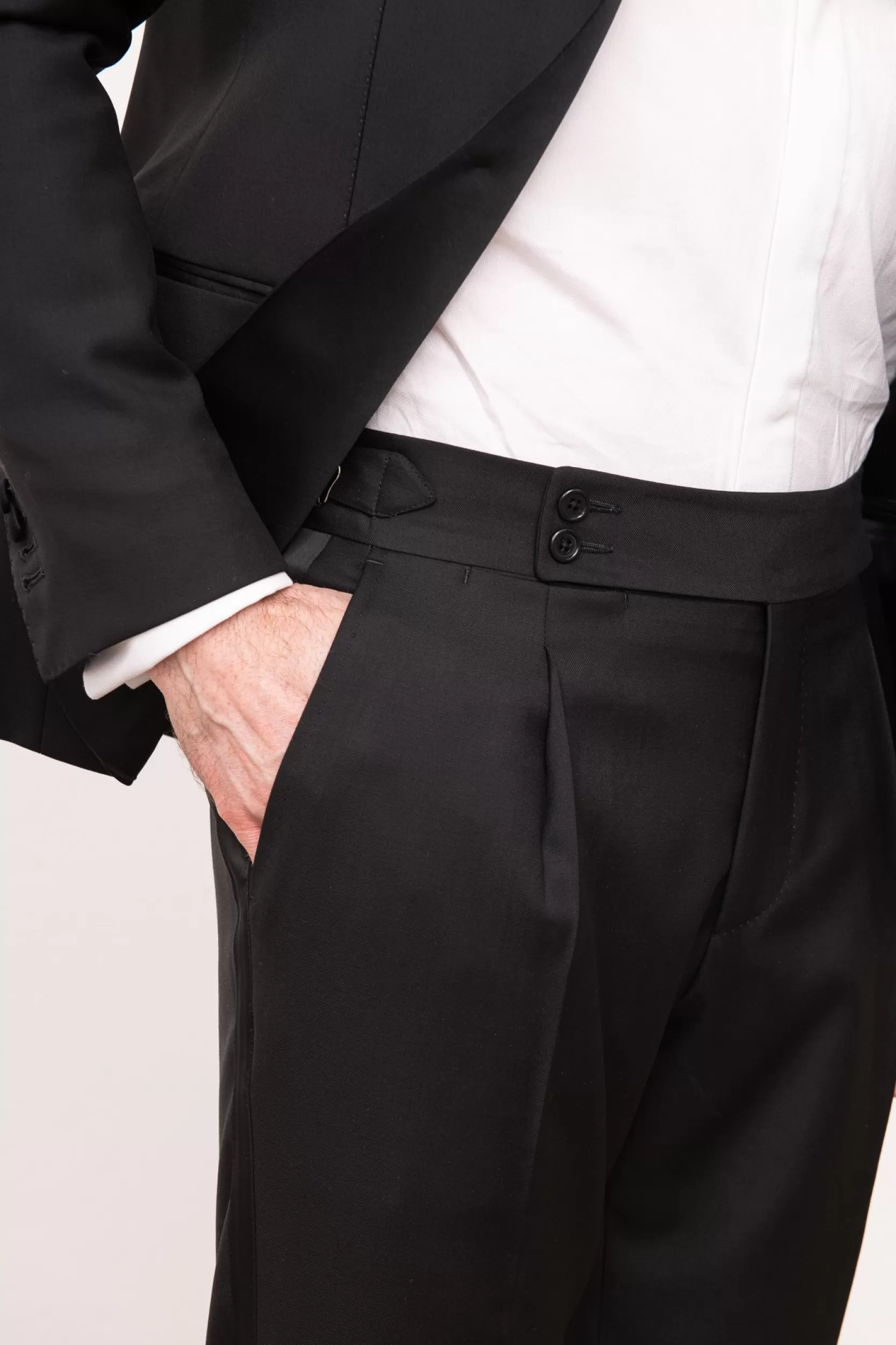 Abbiamo creato per questo abito un pantalone su misura con pinces singole , vita alta, ampia cintura con linguetta estesa e fibbiette laterali . Troverai la qualità dei dettagli nelle tasche laterali con cuciture AMF, nella fessura a V nella cintura posteriore, nella tasca posteriore a filetto e nella tasca per le piccole monete. Abbiamo lasciato del tessuto extra all’interno delle cuciture, in modo da consentire semplici modifiche se necessario. Ciò consente di lasciare fuori la vita, i fianchi e le gambe. Il polsino è lasciato lungo apposta in modo da consentirne l’uso corto, lungo o con risvolti, dando così quel tocco di individualità.
