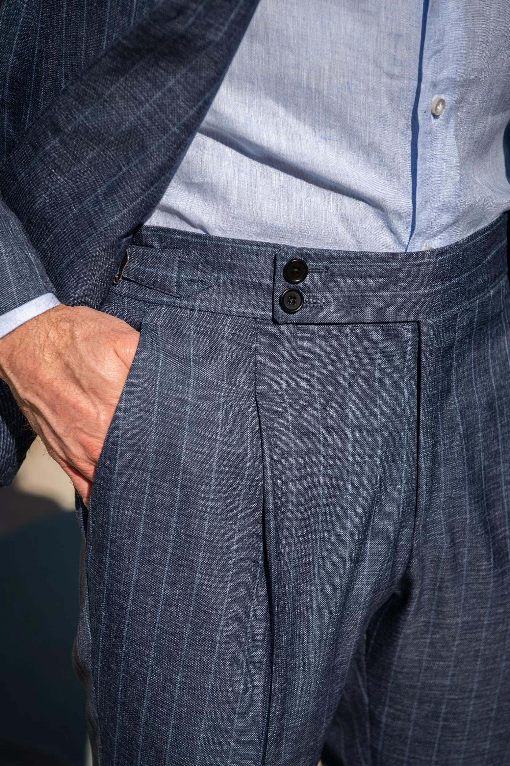 Pantaloni Soragna: vita alta con vestibilità semi-slim, vita ampia e allungata con 2 bottoni, piega unica e regolatori laterali
