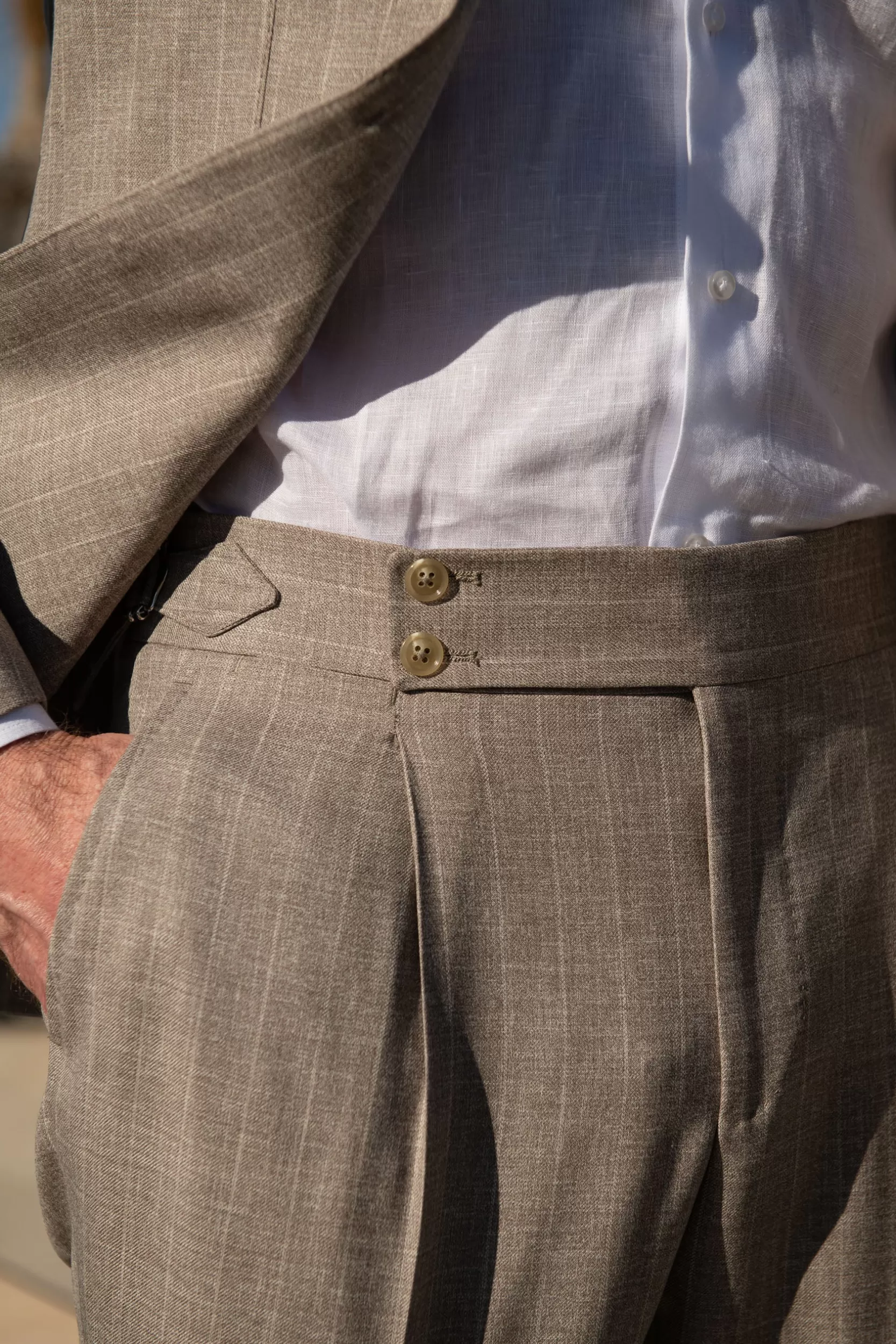 Pantaloni Soragna: vita alta con vestibilità semi-slim, ampia cintura estesa con 2 bottoni, una piega singola e fibbiette laterali